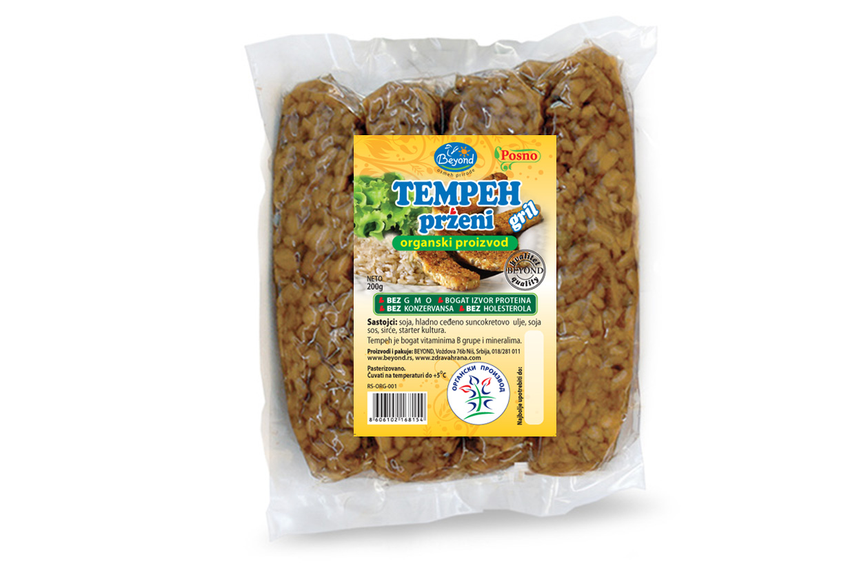 Tempeh prženi je izuzetno hranljiv i ukusan proteinski proizvod od fermentisanih sojinih zrna od organski proizvedene soje u vidu šnicli začinjenih tamari soja sosom koji brzo daje osećaj sitosti. Veoma primamljiv za osobe koje su u prelaznoj fazi ka prestanku konzumiranja namirnica životinjskog porekla. Služi se podgrejan uz povrće i žitarice, a može se dodati i u sendviče!